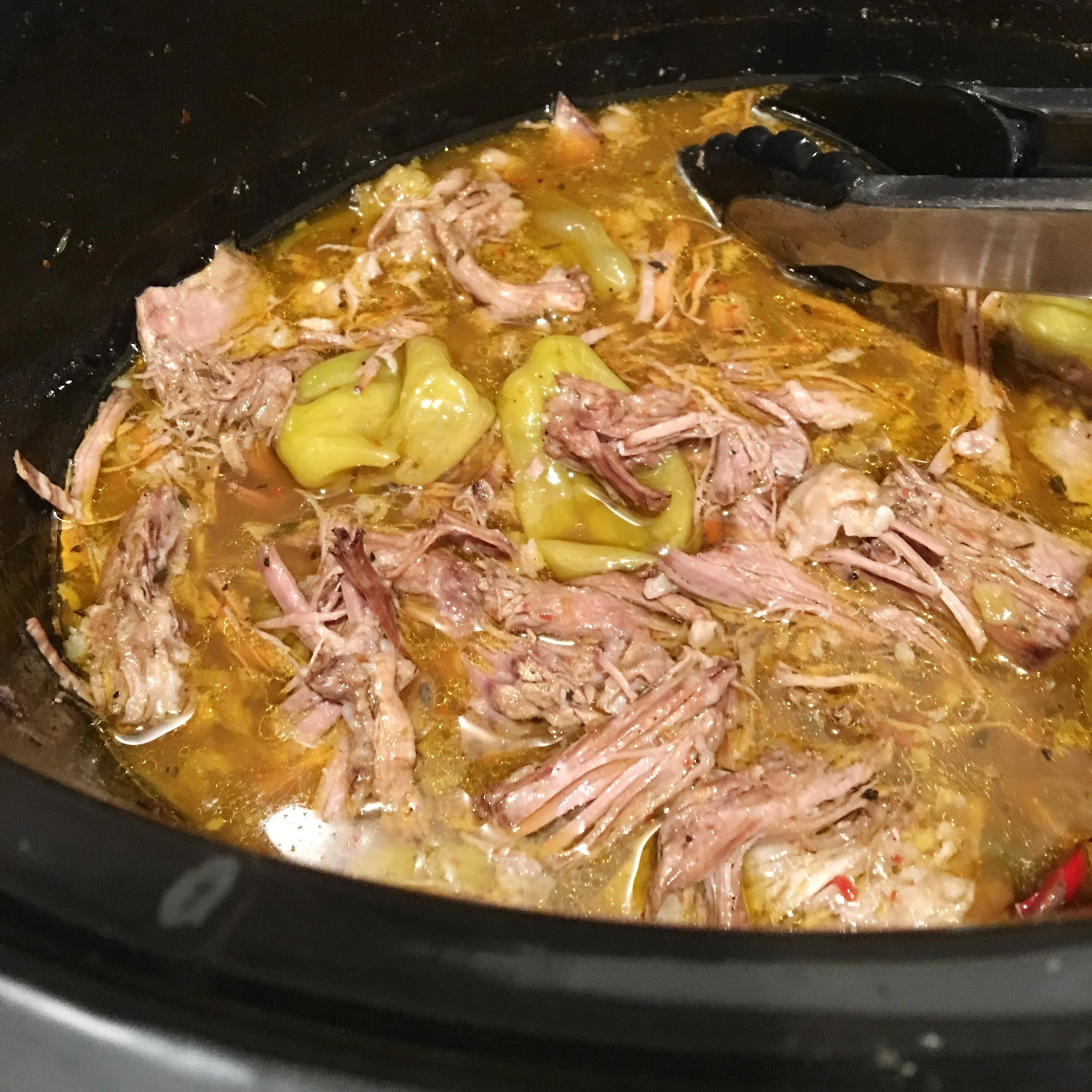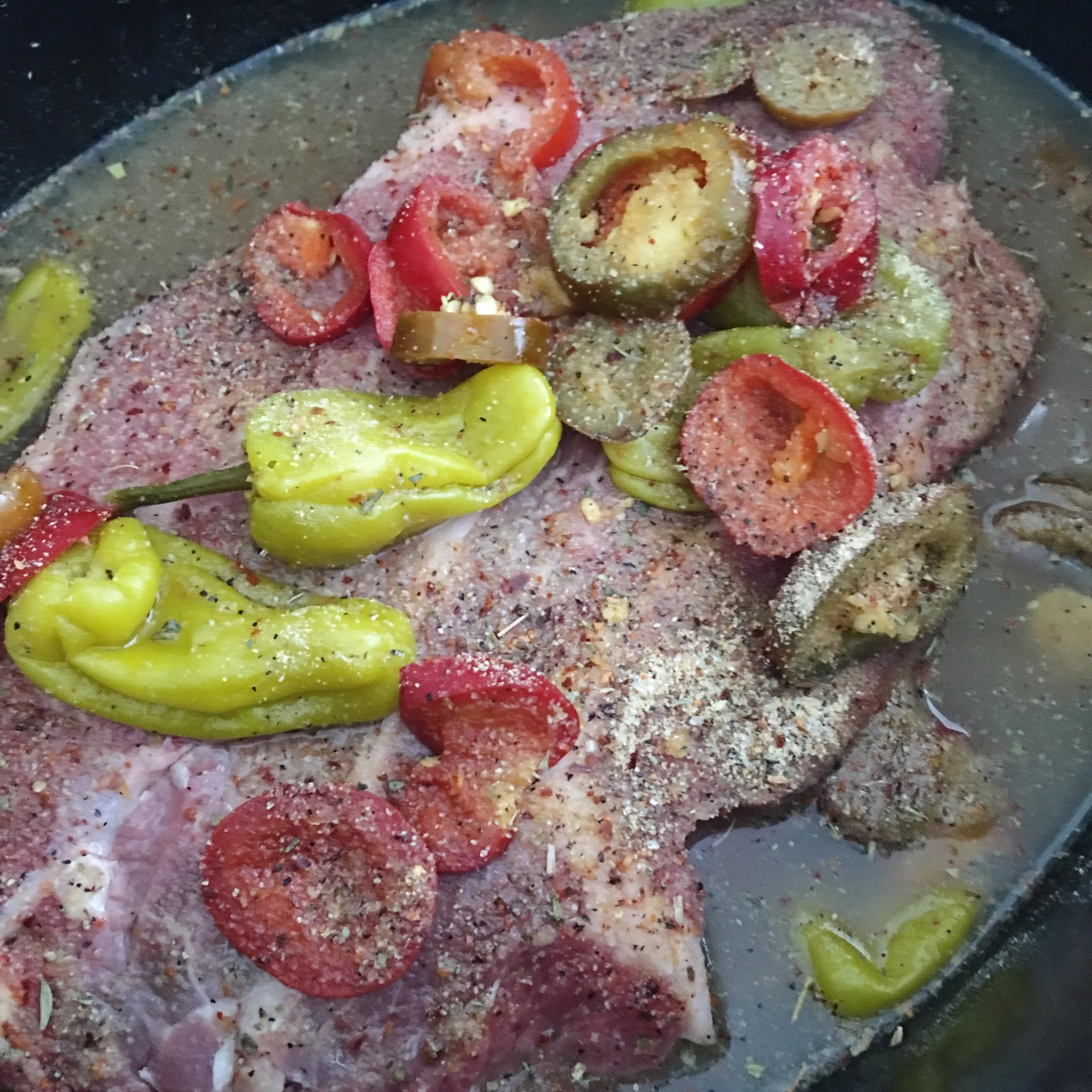 half a jar of hot cherry peppers with juice - also a 12 oz jar (if you don't like spice, just use the whole jar of peperoncinis)