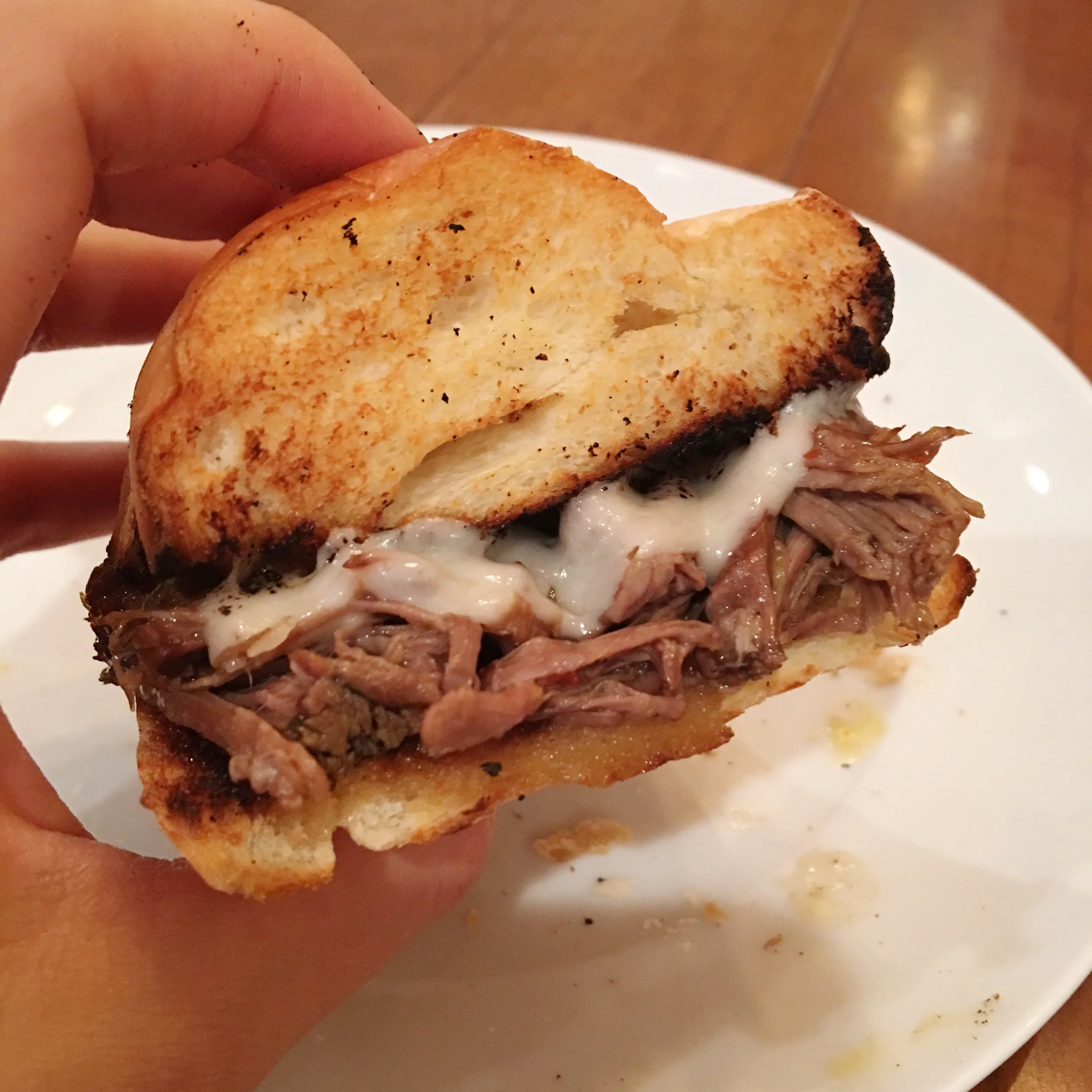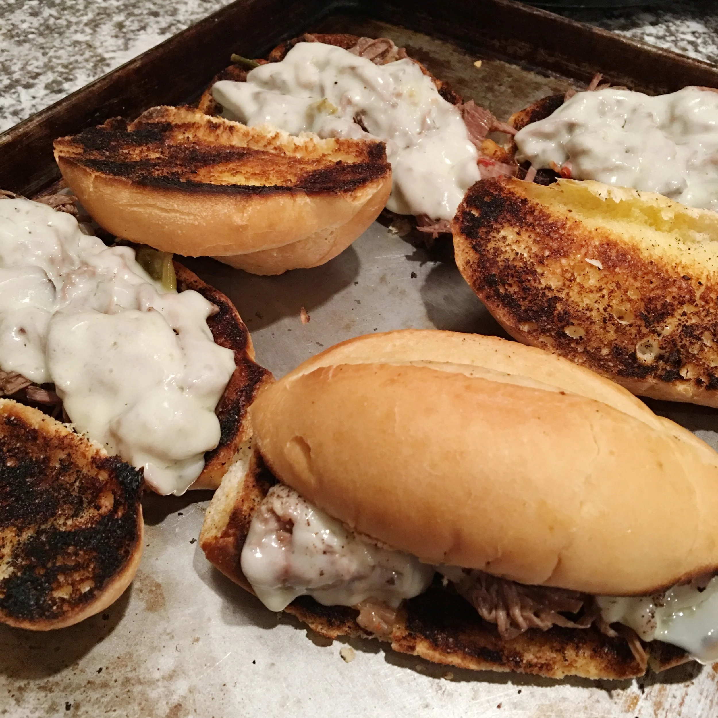 Halve the french bread and butter or spray with coconut oil. Place them underneath the broiler for a little bit - don't take your eyes off of it because it will brown FAST. Once toasted, add shredded beef, add a slice of provolone or a sprinkle of mozzarella, return back to the broiler and watch until the cheese melts.